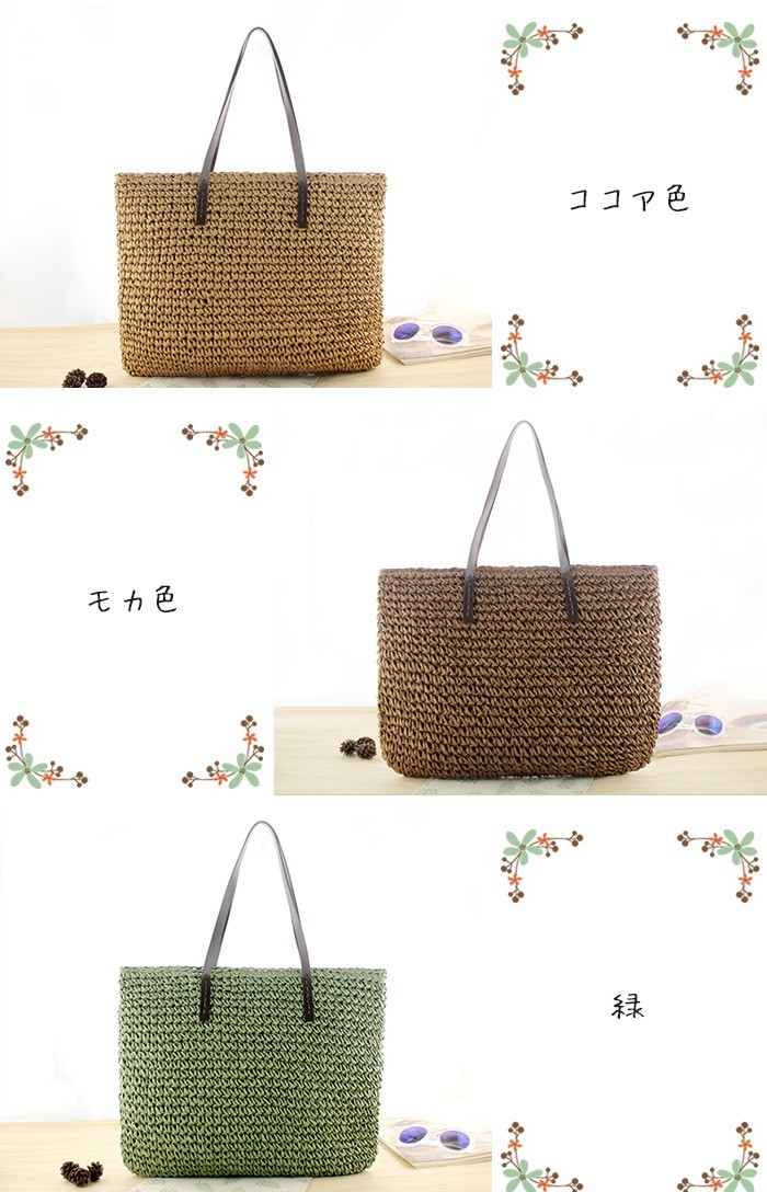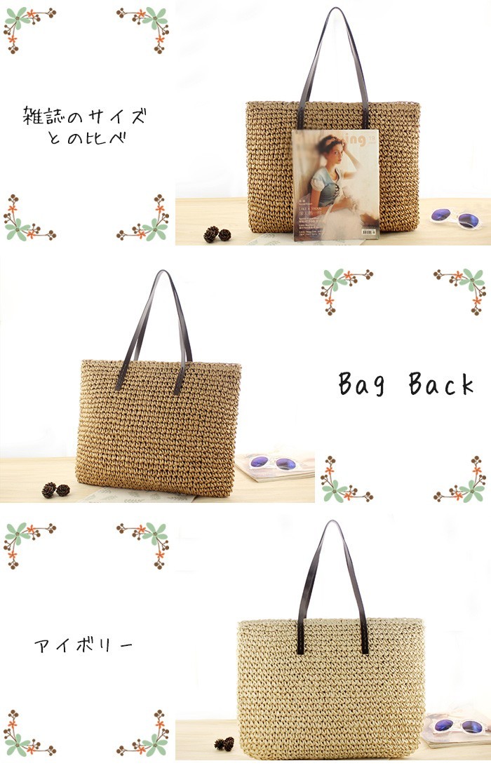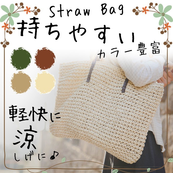 ★ご注意:こちらの商品はお客様がご入金後、メーカーから取り寄せさせて発送する予定です。ご入金からお届けまで約1-7日ほど時間がかかります。予めご理解いただきました上でご注文下さいますようお願いいたします。★ナチュラルなかごバッグが新登場!★女性のリアルな「欲しい!」から生まれたデザイン!★春夏のお出かけに連れて行きたい、爽やかなバッグ!★女子力もアップする!★持ってるだけで大人可愛いかごバッグ!★素材:ストロー ★重量:約0.5kg★カラー:ホワイト、ベージュ、ライトブラウン、ダークブラワン、緑(写真参考)※画面上と実物では多少色具合が異なって見える場合もございます。ご了承ください。★サイズ(cm):本体:縦35cm 横48cm 持ち手(高さ):22cm※サイズは平置きでの実寸になっております。1?3cmの誤差がある場合があります。予めご了承下さいませ。