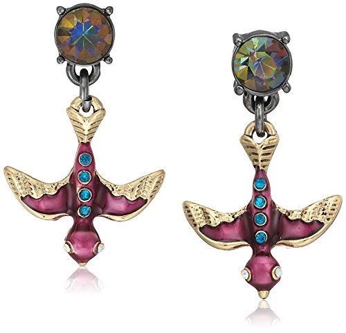 gold and hematite tone mismatched flying bird earrings with green multi-faceted stones