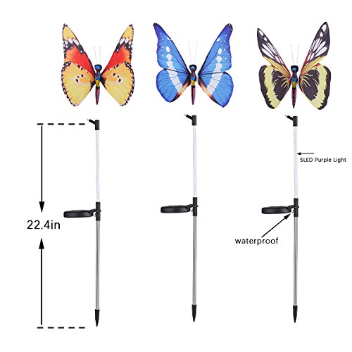 -. Feature : AUTOMATICALLY LIGHTS UP: Butterfly solar lights automatically lights up in the dark to illuminate your garden and pathway. Perfect as path lights and in-ground lights Suitable for the Garden, Trees, Flowers, Flowerbed, Fence, Walkway, this garden solar lights Does it all / 【Solar Powered】Solar powered, auto turned on at night with built-in light sensor, no extra wire or electricity needed to decorate your garden. / 【Multicolor】Color changing led bead lights up a vivid garden landscape of colorful "flying" butterflies in the flowers. / TRANSPARENT STAKE: The 2nd generation solar lights has 5 purple LED light inside transparent stake which has fabulous light effect / GUARANTEE SERVICE: 100% Satisfaction guarantee and reliable customer service within a 24 hour time support, 30 day back money guarantee - 3 month warranty
