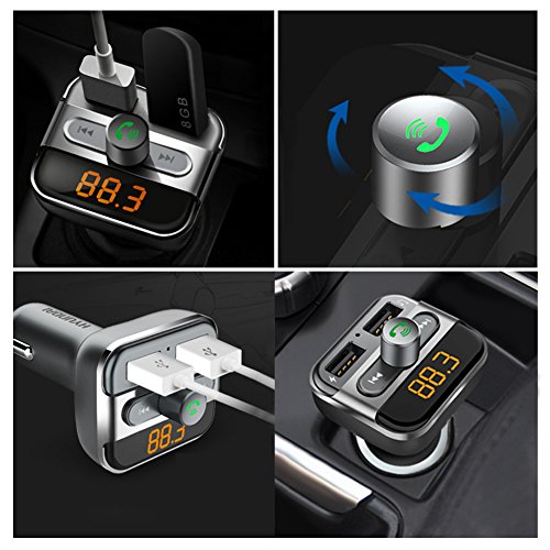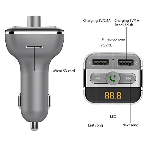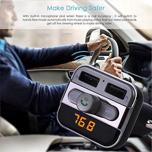 ENJOY QUALITY MUSIC AND QUICK CHARGER--Do not waste your time, when you are in car, you can simultaneously charge your phone and listen to music using the bluetooth feature, With two USB ports, you can charge your devices at the same time(Note: The one on adapter can only charge your device, the one on MP3 player can charge your device and supports USB disk play)