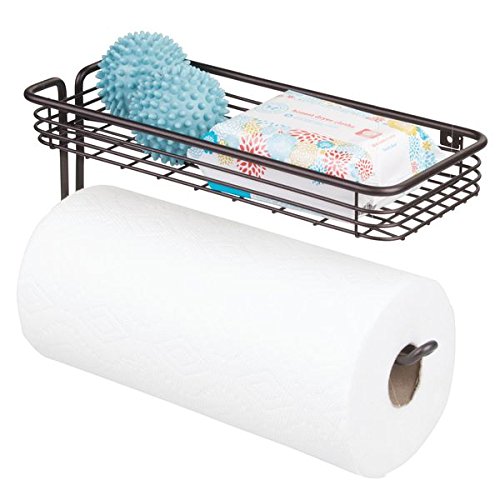 mDesign Paper Towel Holder with Shelf for Laundry, Kitchen, Garage - Wall Mount, Bronze
