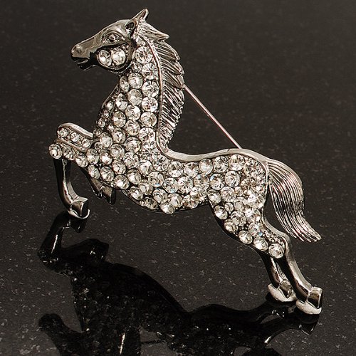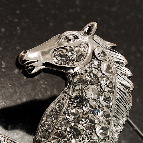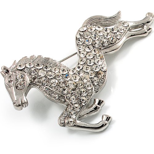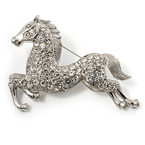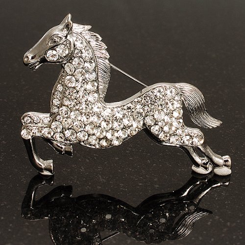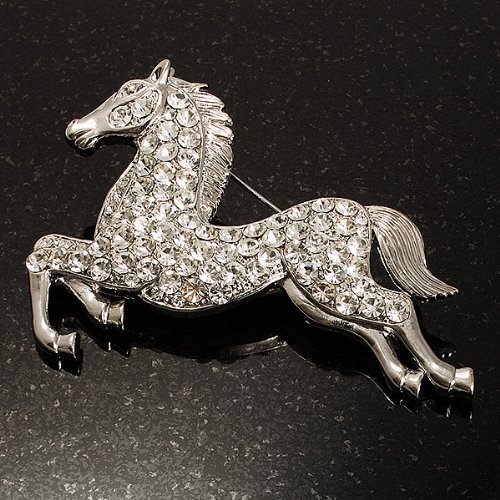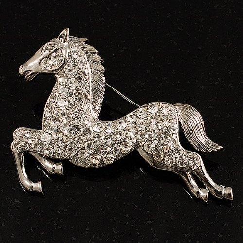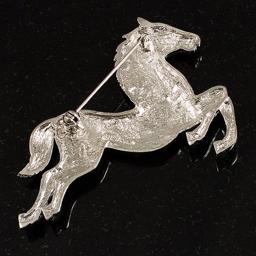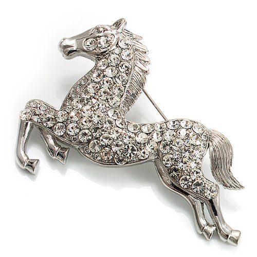 Perfect for any animal lover! Unleash your sense of style with this lovely Clear Crystal Galloping Horse Brooch. Featuring a bold galloping horse design, crafted in shiny rhodium plated finish and pave-set with sparkling clear crystals for a fabulous look. The brooch measures about 7cm x 5cm and secures with a flag pin and revolver clasp. Fantastic gift idea - Christmas, birthday, anniversary, mothers day, etc. Easily fastens to any bag, hat, coat or jacket.Feature