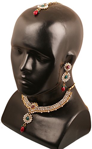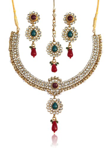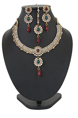 Alloy metal, white tone, beautiful Indian Kundan look wedding wear necklace set with extra beauty of red faux ruby, green emeralds and red drops comes, with identical mangtika. For Perfect Matching, search for TOUCHSTONE BANGLES.