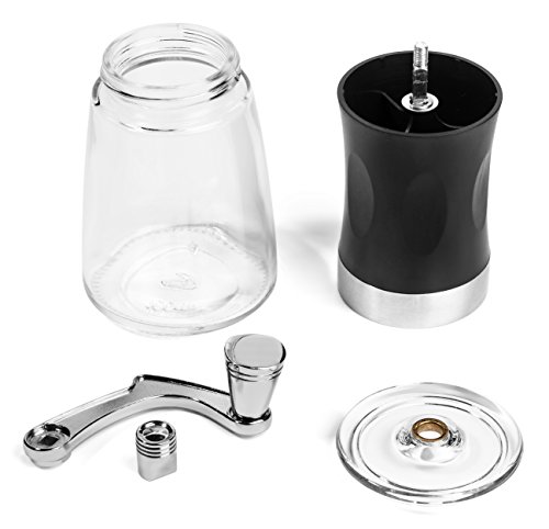 - Feature : ★COMBO FLASH SALE★ 25% OFF on KONA French Press, See "Special Offers" Below For Details... QUIET & PORTABLE non electric coffee mill, SMALL & SLIM perfect for up to 2 coffee drinkers while camping, traveling or at the office. Ergonomically designed crank handle detaches for compact storage. / HEAVY DUTY HAND CRANK & AXLE ensures no stripping, guaranteeing years of fresh ground coffee. EASY CLEAN & STATIC FREE glass jar able to store up to 50 grams of ground beans for 3 cups of coffee. / HIGH DENSITY CONICAL BURRS made from industrial ceramic with temperature stability, high wear & corrosion resistance for a precise, uniform grind. / LOCKING TOP so bean particles don't fly out of dispenser while grinding, customized hopper to fit the mouth of an Aeropress single serve coffee maker. / ADJUSTABLE BURRS to produce a range of grind size, from a ultra fine setting for pour over drip & espresso to extra coarse for french press & percolator brewing. Plus no disassembly required to adjust.