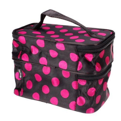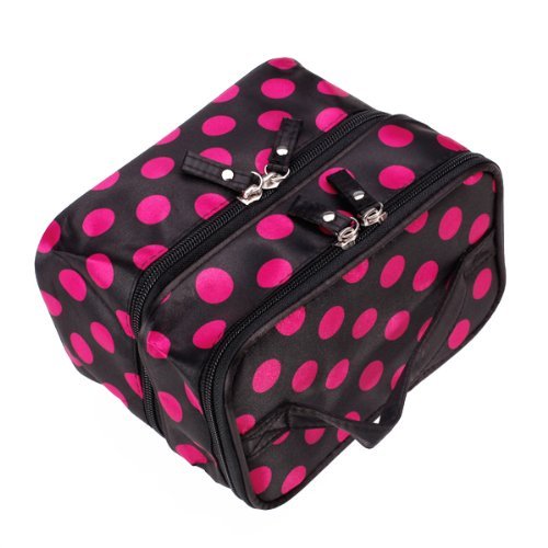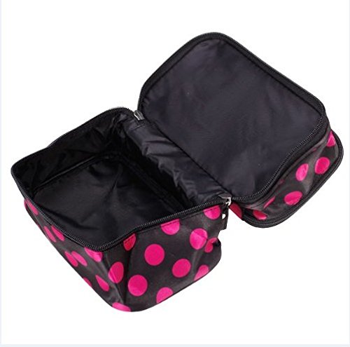 Designed with zipper closure, dots pattern, with a mirror inside, strap on top for carrying easily, a great tool for holding cosmetic for ladies. Can be used to keep your eyeliner pen, brushes, perfume, cream, mascara cream, lipstick, concealer, foundation, eye shadow powder, nail polish, toner, etc. light weight to carry, fit for daily or travel case use.Feature