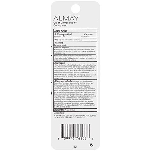 Almay Clear Complexion Concealer, Medium helps you achieve clear complexion with a 4-in-1 Blemish Eraser formula. The 4-in-1 Blemish Eraser covers, clears, calms and controls blemishes for a flawless complexion. The Almay Clear Complexion Concealer contains a mineral complex that absorbs oil for a matte look. It also contains aloe and chamomile to soothe skin and help reduce redness. This concealer helps clear and prevent acne blemishes for an even complexion. The full range of Almay Clear Complexion formulas contain salicylic acid, a proven blemish-fighting ingredient. Use with Almay Clear Complexion foundation and pressed powder for a flawlessly clear complexion. Available in 3 shades. To use: clean skin thoroughly before applying the concealer. Cover entire affected area with a thin layer and blend into your complexion. Dermatologist tested. Almay - Quality ingredients. Hypoallergenic. American science.Feature