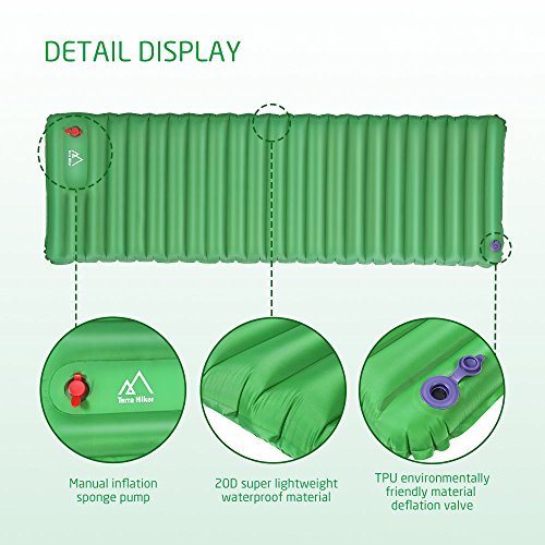 Ultralight-weight: Terra Hiker mat is made of 20 D nylon fabric. Waterproof, soft and comfortable against skin; designed with environmentally friendly TPU material layer inside; easy to carry at just 1.43 lb/650 g