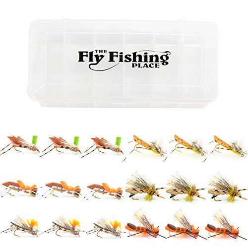 -. Binding : Misc. -. Brand : The Fly Fishing Place -. EAN : 0767872625129 -. Feature : Six great easy to see foam hopper trout or bass fly fishing fly patterns / Perfect for bank-popping in the heat of summer / Super effective flies for trout, bass or panfish - Includes fly box - suitable for gift giving! / 18 flies total - 3 each of 6 Patterns - Hook Size 10 / Perfect as an indicator fly for a fly fishing hopper dropper rig -. Label : The Fly Fishing Place -. Manufacturer : The Fly Fishing Place -. PackageQuantity : 18 -. ProductGroup : Sports -. ProductTypeName : SPORTING_GOODS -. Publisher : The Fly Fishing Place -. Studio : The Fly Fishing Place -. Title : Fishing Fly Assortment - Foam Body High Visibility Grasshopper Dry Fly Collection with Fly Box - 18 Flies - Hook Size 8 and 10 - Fly Fishing Hoppers -. UPC : 767872625129