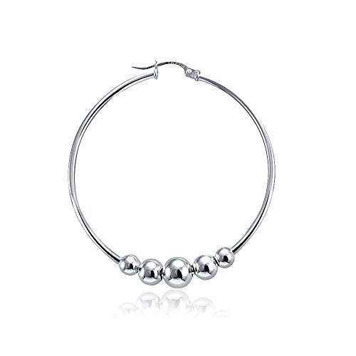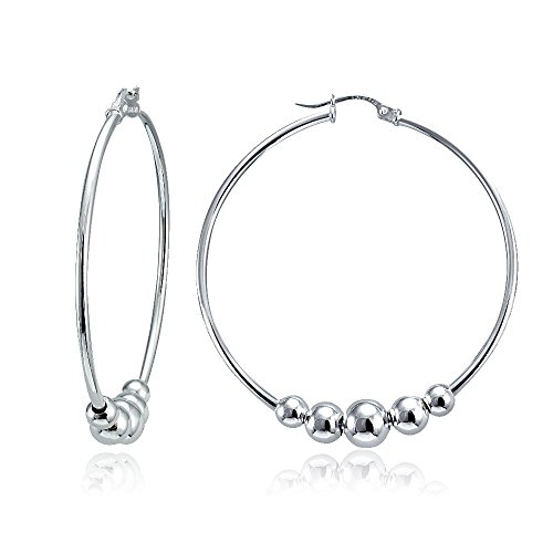 Earrings feature sterling silver high polished round hoops with polished and hammered beads.