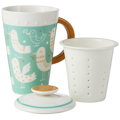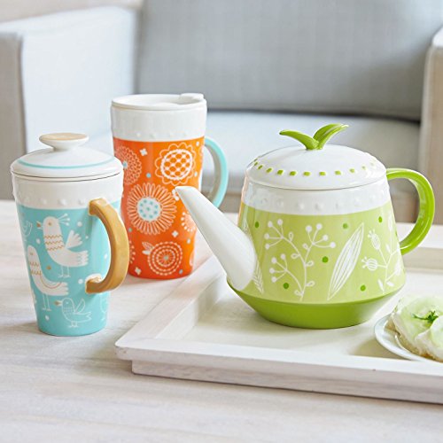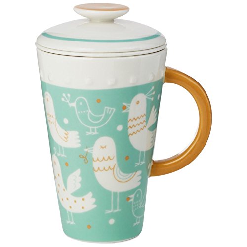 This colorful ceramic mug with comfortable handle is accentuated by a turquoise and brown bird motif. It has a removable lid with button handle for perfect steeping temperature, along with a ceramic infuser basket for bagged or loose tea.