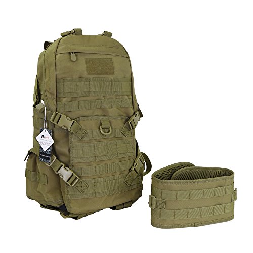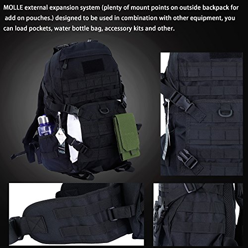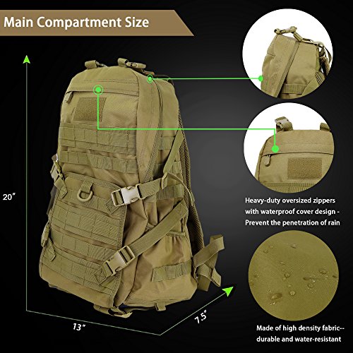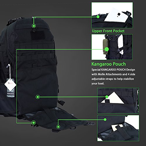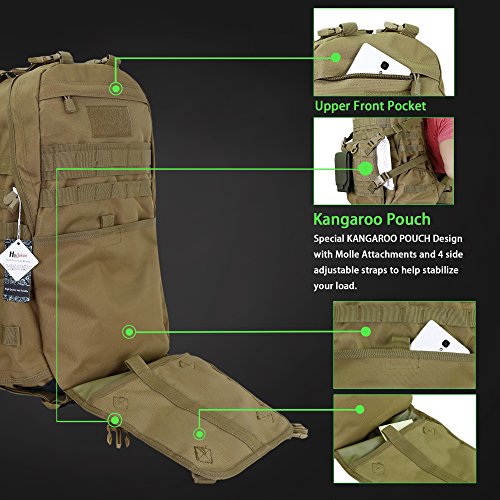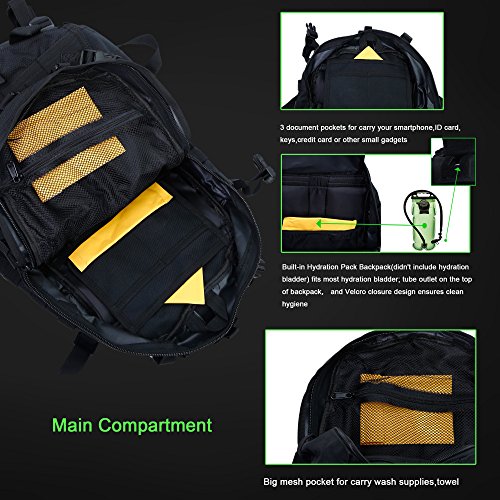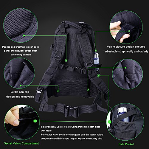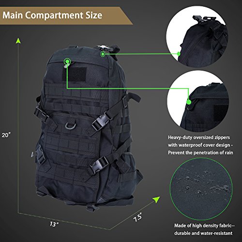 -. Feature : Made of durable 600D nylon oxford cloth with a water-repellant coating. The Military Tactical Backpack has durable construction with Heavy-Duty Waterresistant Nylon pack cloth construction and heavy-duty oversized zippers for extra durability / LARGE CAPACITY& PLENTY OF COMPARTMENTS: Capacity: 40L, Total of 13 compartments: Main Compartment(20"x13"x7.5") contains three document pockets, one big mesh pocket and One built-in Hydration Pack Backpack(didn't include hydration bladder) Fits most hydration bladder; One Upper Front Pocket; One Lower Front Pocket; 2 Side Elastic Pockets with Molle; 2 Secret Velcro Compartments; One newspaper/map pocket; One compressible KANGAROO POUCH and 4 side adjustable straps to help stabilize your load. / MOLLE SYSTEM: MOLLE external expansion system (plenty of mount points on outside backpack for add on pouches.) designed to be used in combination with other equipment, you can load pockets, water bottle bag, accessory kits and other. / ERGONOMIC DESIGN & REMOVABLE GIRDLE: Padded and breathable mesh back panel and shoulder straps offer cushioning comfort, while also promoting air circulation along your back and shoulders; All straps can be adjustable with Buckle; Girdle non-slip design and removable, The girdle can be used alone, MOLLE webbing on the Girdle ensures you have enough room to add more pouches and gear. / All Zippers waterproof cover design: Effectively prevent the penetration of rain, to ensure the strength of the product while ensuring long-term use in wet environments. One Velcro patch Holder on the Upper front,you can personality your backpack; One reinforced handle on the top of pack, Huijukon tactical assault pack backpack can be used as 3 day assault pack, bug out bag backpack, range bag, hunting backpack, survival backpack, army backpack, trekking backpack or day pack for daily use