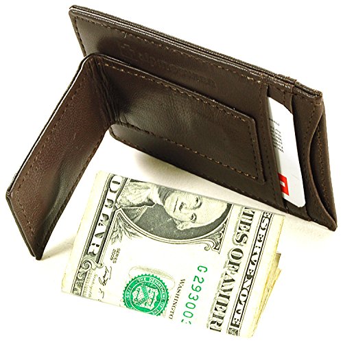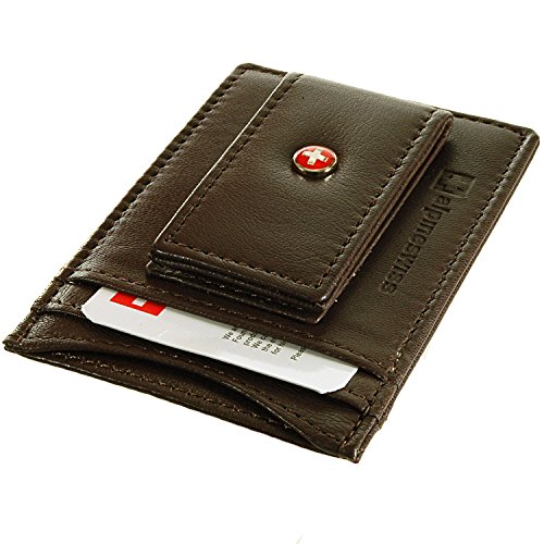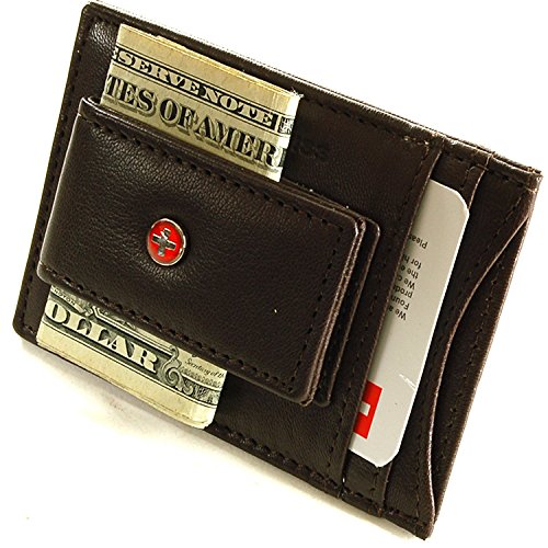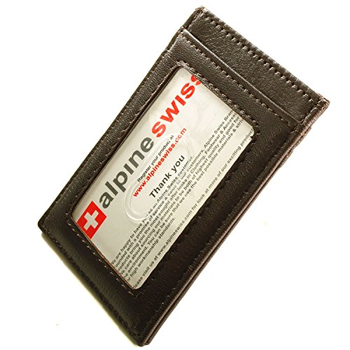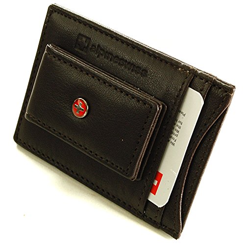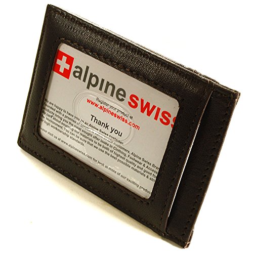 Front Pocket Wallet Leather Money Clip By Alpine SwissIf you have never used a money clip or a slimline front pocket wallet, please give this a try.  You will love its efficiency and how good it is for your lower back.  Carry all you need in a small comfortable wallet and stop sitting on a big fat wallet.Features:Strong Magnet Money ClipMeasures: 4" x 2 7/8" x 3/8" Genuine LeatherMultiple Credit Card SlotsID WindowMSRP $35.00