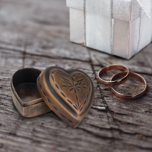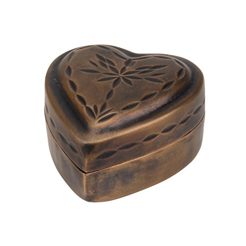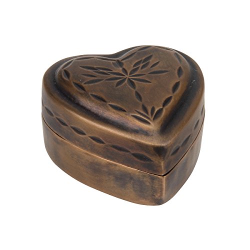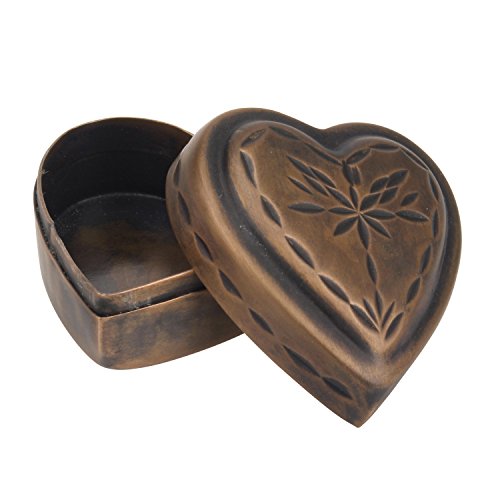 - This heart shaped keepsake box features a vintage copper finish and a decorative etched floral design on the removable lid giving a vintage feel