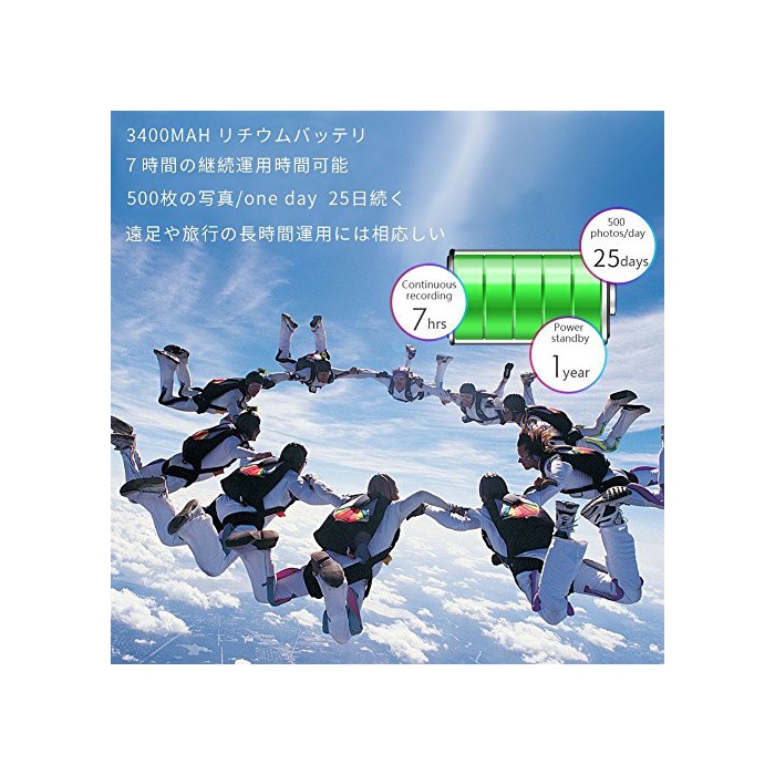장시간 배터리 구동:대용량3400mAh리튬 이온 배터리 내장,7시간의 연속 녹화,12개월 장시간 스텐바이 이 생깁니다!1일(날)500매의 사진을 찍는 경우,50일(날) 이상 연속해 사용으로 옵니다.60초마다 자동적으로 사진을 찍는 경우,ECO Start-Stop기술을 통해 17.5일간 연속해 사용하는 것 를 할 수 있습니다.옥내의 도난 방지,운전 기록,아웃도어 스포츠 같은 장기간의 녹화에 최적!