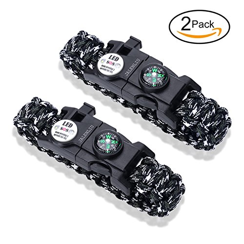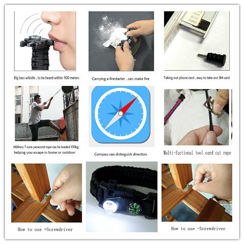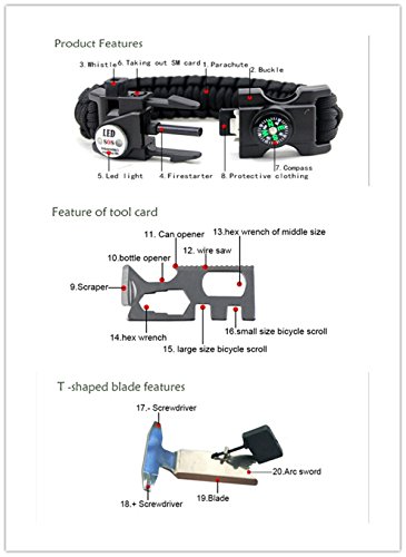 - ★Super great Mini-design:Our product is a 20 in-one Multi-functional Emergency outdoors survival paracord bracelet,it including whistle, Take out phone card,buckle,S0S LED distress light ,firestarter,4 functions T shape knife,8 functions tool card ,compass and Paracord.