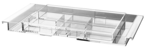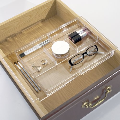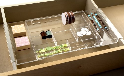 - Feature : Stores a variety of office, craft or cosmetic supplies in your drawer. Hangs on drawer sides to allow for storage underneath. / Great for taking the clutter off your desk or vanity and keeps all your supplies organized in the drawer! / Expands to fit drawers from 11-3/4" up to 18-3/4". / Crystal clear design allows you to see the contents of the drawer underneath. / Dimensions: 12-3/4"L x 8-1/4"W x 1-3/8"H