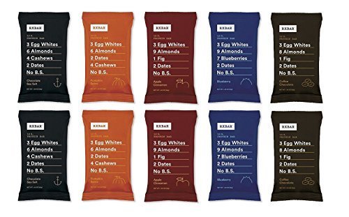 -. Feature : RxBar Real Food Protein Bars Variety Pack, 5 Flavors (Pack of 10) / Each variety pack of RxBars contains 2 bars each of 5 flavors / Healthy, delicious protein bars made with nutritious, real food ingredients.12g of protein in every 1.83 ounce bar comes from all-natural egg whites and raw almonds. / 12 grams of protein in each bar comes from 6 to 8 ingredients and they are all 100% natural. / Pumpkin Spice, Blueberry, Coffee Cacao, Apple Cinnamon, Chocolate Sea Salt