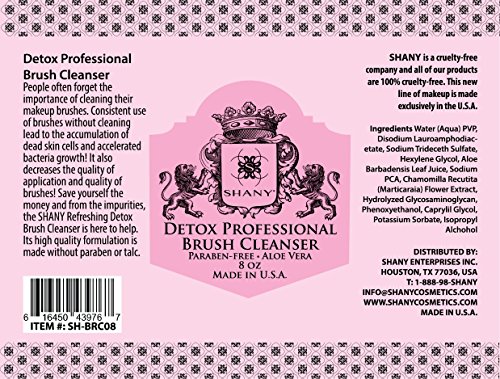 People often forget the importance of cleaning their makeup brushes. Consistent use of brushes without cleaning lead to the accumulation of dead skin cells and accelerated bacteria growth. It also decreases the quality of application and quality of brushes. Save yourself the money and from the impurities, the SHANY Refreshing Detox Brush Cleanser is here to help. Its high quality formulation is made without paraben or talc. It also contains healing and soothing properties from the Matricaria Flower Extract (Chamomilla Recutita) and Aloe Barbanis Leaf Juice. It's a perfect cleaner for everyone (even those with sensitive skin). This brush cleanser works with natural and synthetic hair brushes. Made in U.S.A.Feature