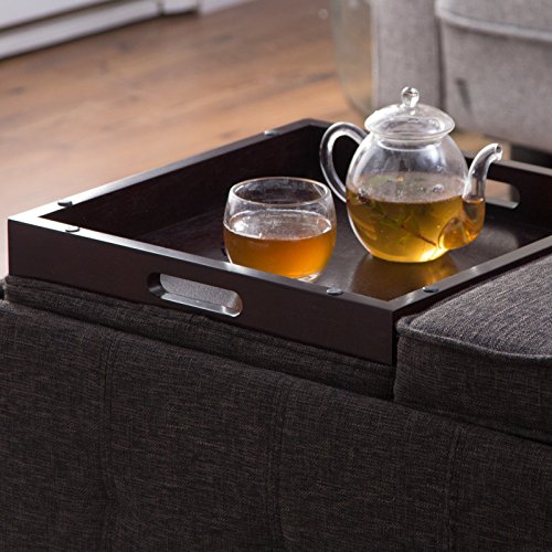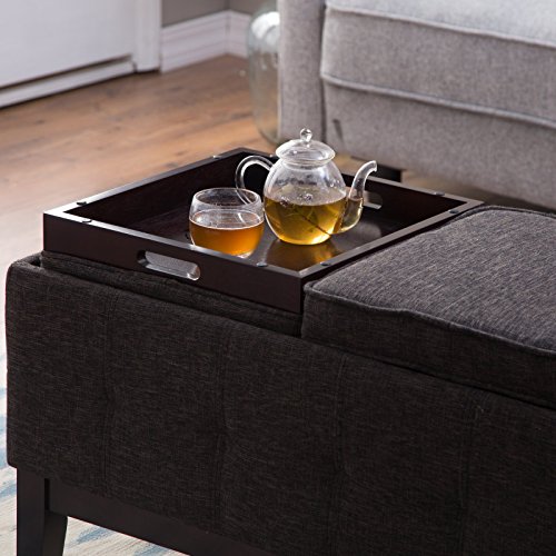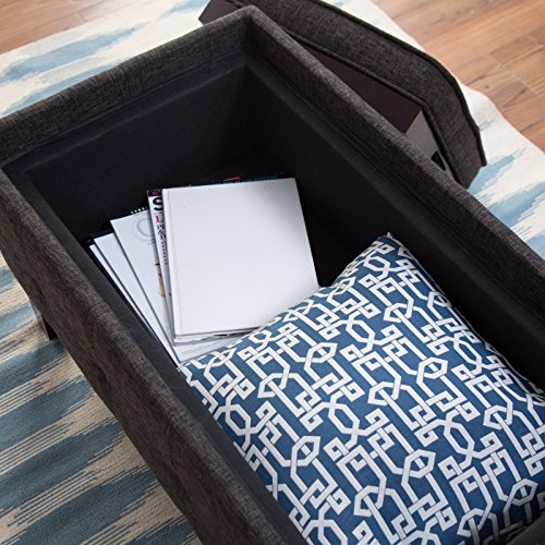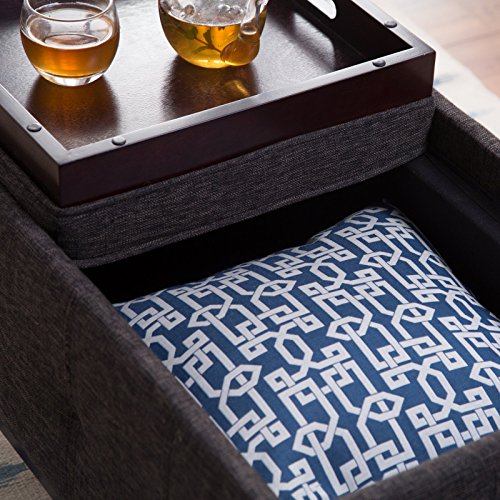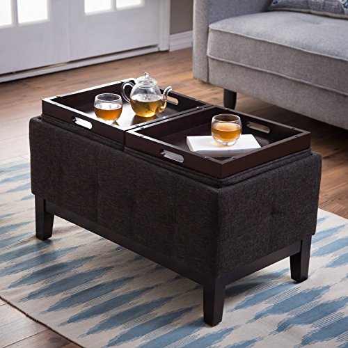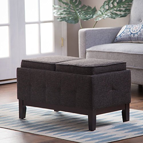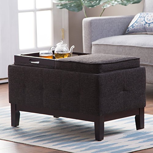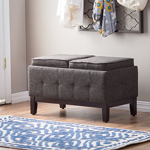 -. Binding : Lawn & Patio -. Brand : Belham Living -. Color : Gray -. Feature : Dimensions: 32L x 18D x 18H in. / Constructed of a poplar wood base with 90% terylene, 10% cotton upholstery / Subtle side tufts add dimension / Top cushions flip to reveal tray tables and storage space underneath / Tray tables and frame finished in black -. Label : Foremost Groups Inc -. Manufacturer : Foremost Groups Inc -. MPN : YLF20140331001 -. PackageQuantity : 1 -. PartNumber : YLF20140331001 -. ProductGroup : Lawn & Patio -. ProductTypeName : OUTDOOR_LIVING -. Publisher : Foremost Groups Inc -. Studio : Foremost Groups Inc -. Title : Belham Living Sullivan Storage Bench Ottoman in Dark
