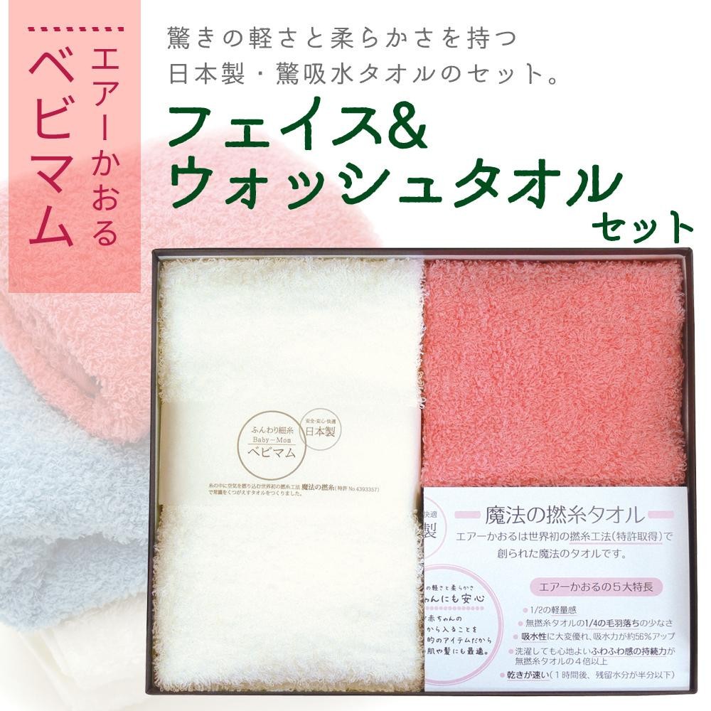 | 伝統と熟練技術で作られた、驚きの軽さと柔らかさの日本製・驚吸水タオルです。「エアーかおる」シリーズの「ベビマム」は、普通のタオルと同じ重さで2倍のボリューム感、無撚糸タオルの1/4の毛羽落ちの少なさ。「ベビマム」は、毛羽が赤ちゃんの口や鼻から入ることを防ぐ目的のアイテムだから、女性の肌や髪にもぴったり♪ギフトにもおすすめです。 |