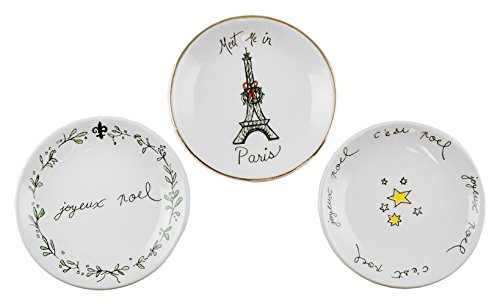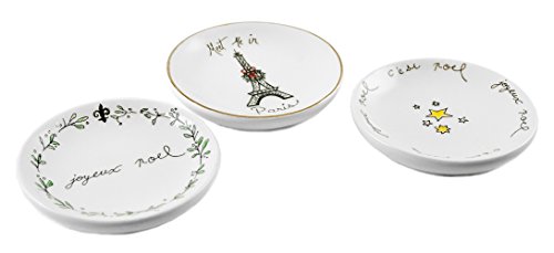 -. Binding : Kitchen -. Brand : Creative Co-op -. Color : Multicolor -. EAN : 0191009001867 -. Feature : Set of 3 Trinket Dishes / Measures 3" round / Made of ceramic / Features a set of white, french themed trinket dishes with different sayings: (1) says: "Joyeux Noel, C'est Noel" with a star design, (2) says: "Meet me in paris" with an Eiffel Tower design & (1) says: "Joyeux Noel" with a fleur de lis wreath trim / Dress up your tabletop with these lovely set! Also, makes a great gift idea! -. IsAutographed : 0 -. Label : Creative Co-op -. Manufacturer : Creative Co-op -. PackageQuantity : 4 -. ProductGroup : Home -. ProductTypeName : HOME -. Publisher : Creative Co-op -. Studio : Creative Co-op -. Title : French Themed Merry Christmas Trinket Dishes - Set of 3 -. UPC : 191009001867