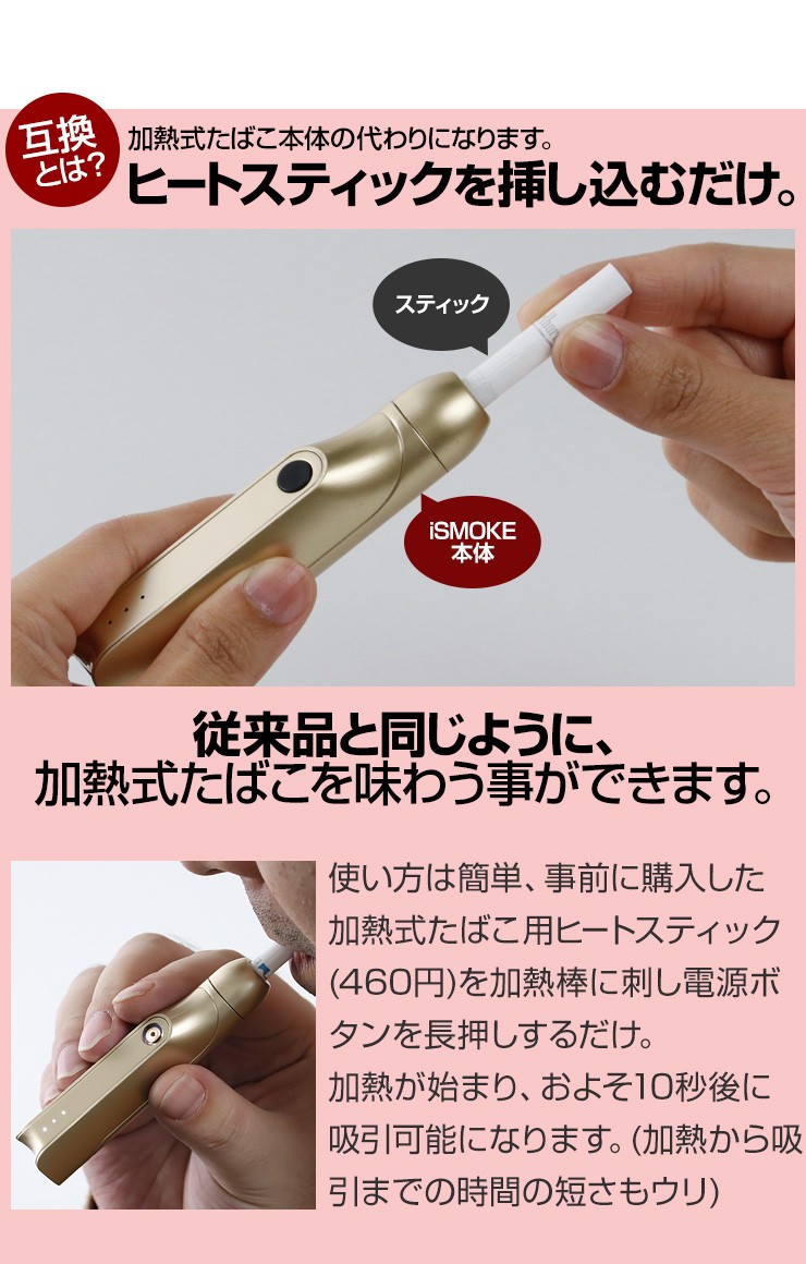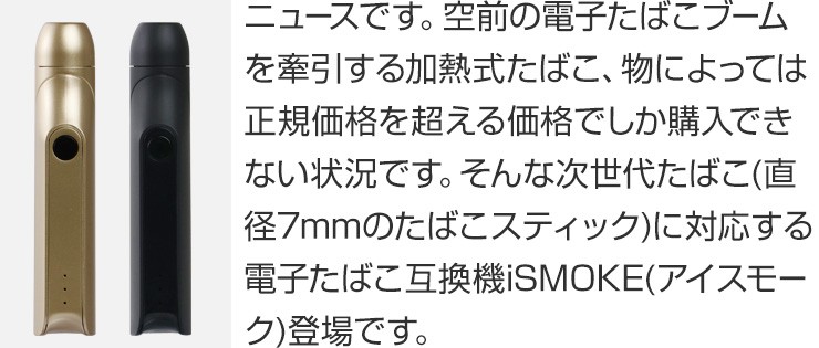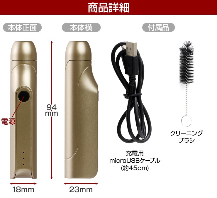 | セット内容 | ・iSMOKE本体・充電用misroUSBケーブル・クリーニングブラシ・日本語ユーザーガイド |