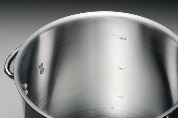 鍋の渕がラッパ型で頑丈!厚口目盛付。