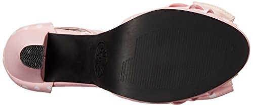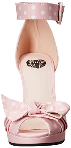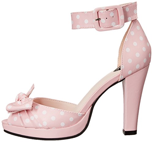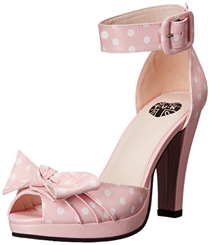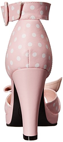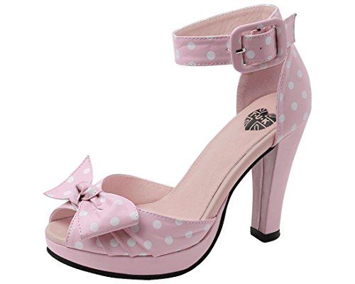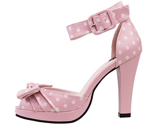 Product Description This heel is seriously retro cute with an adorable peep toe and flattering ankle strap. Bubblegum pink and white polka dot faux leather, gathered bow and adjustable ankle strap. 0