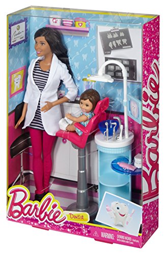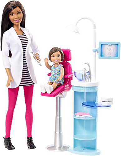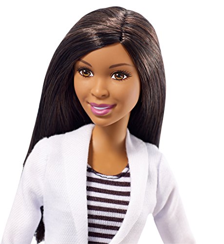 The Barbie dentist doll is ready to see patients in striped shirt, pink pants, matching shoes and white dentist's coat