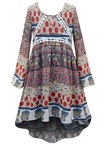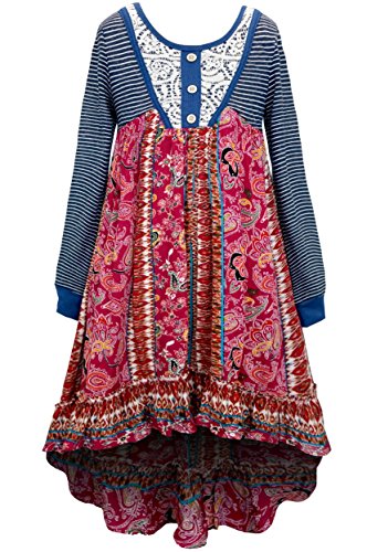 Give her a twirl in this flowing bohemian-inspired dresses by Truly Me! These wide bell long sleeve dresses feature a hi low hem with an overall bohemian paisley print or a bohemian geometric print on center with complimentary embellishments, featuring lace trim or contrast binding. These dresses are the perfect staple to any wardrobe, perfect to wear for Fall, Spring, Summer, and Winter. Layer it or wear it on its own, this will be your little girl's new favorite dress!Feature