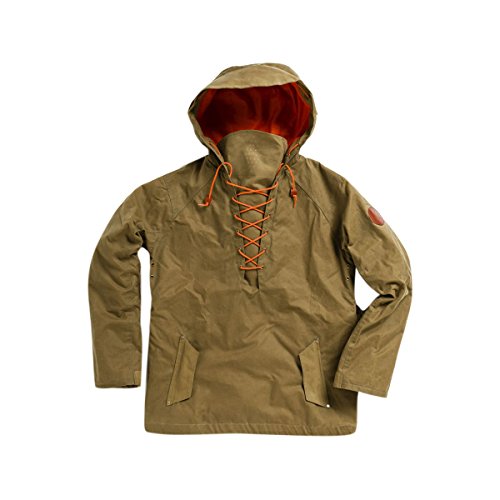 Studio : Alps Meters Publisher : Alps Meters Product Description Modeled on the historic garments worn by the United States 10th Mountain Division Alpinists, the Alps and Meters Men's Alpine Anorak Pullover forges traditional design and modern technology to deliver protection and comfort. Constructed of a fortified British Millerain waxed canvas exterior and an internal waterproof membrane, this pullover helps you stay dry and protected whether you're enjoying a spring ski or exploring the street of your favorite resort town. A front lace closure and face guard provide enhanced wind protection and a personalized fit. Side vents provide breathability on warm days, while the drawcord waist helps seal out cold and snow. 0