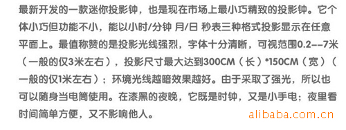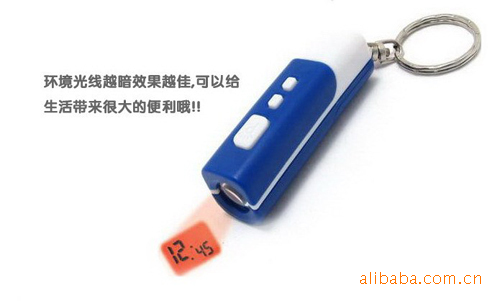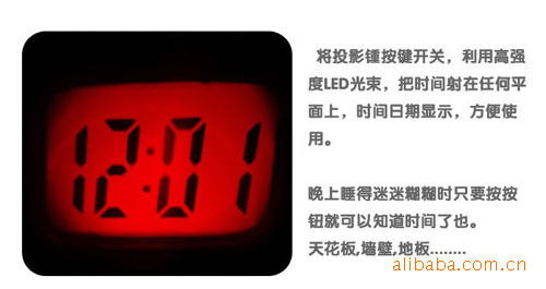Ad hoc light projection? the font is very clear? visual range 0.2--7 meters? projection size reaches a maximum of 300CM(long) *150CM (width)? and very clear; in order to meet thevisual people? especially the time display form modified by the "type" to "flat type". Due to the strong light? so can also carry when using a flashlight.
