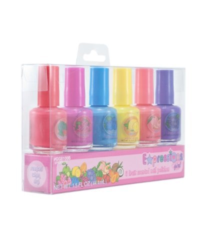 -. Binding : Toy -. Brand : My Princess Academy -. ClothingSize : One Size -. Color : Multi -. Department : womens -. EAN : 0024576871277 -. Feature : Fun 6-pack of yummy fruit scented nail polishes in bright colors / Each polish smells like a different fruit flavor / Set of six comes in a clear gift-box and is ready for giving / Perfect for giving individually as party favors, too / For ages 5 years and older -. IsAdultProduct : 0 -. ItemPartNumber : GG8100B -. Label : My Princess Academy -. Manufacturer : My Princess Academy -. Model : GG8100B -. MPN : GG8100B -. PackageQuantity : 1 -. PartNumber : GG8100B -. ProductGroup : Toy -. ProductTypeName : TOYS_AND_GAMES -. Publisher : My Princess Academy -. Size : One Size -. Studio : My Princess Academy -. Title : Expressions Girl 6-piece Fruit Scented Nail Polish Set -. UPC : 024576871277