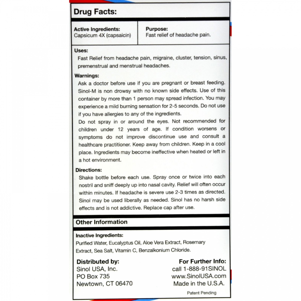 | Sinol Headache Relief Nasal Spray Description: All-Natural Nasal Spray with Capsaicin Fast Headache Relief for Migraine, Cluster and Tension. For the fast relief of pain associated with migraine, cluster and tension headaches. Sinol will work best for headaches when symptoms first occur. Most headaches are caused by a spasm of the blood vessels or muscles around the eyes and across the forehead. Sinol is a fast acting all natural remedy that relaxes the muscles and blood vessels. Our Sinol Headache Nasal Spray can relieve headaches when they first begin and is extremely effective for migraines, cluster and tension type headaches. Disclaimer These statements have not been evaluated by the FDA. These products are not intended to diagnose, treat, cure, or prevent any disease. Dairy Free : Yes Yeast Free : Yes Wheat Free : Yes Vegan : Yes Size : 15 ML Pack of : 1 Product Selling Unit : each |