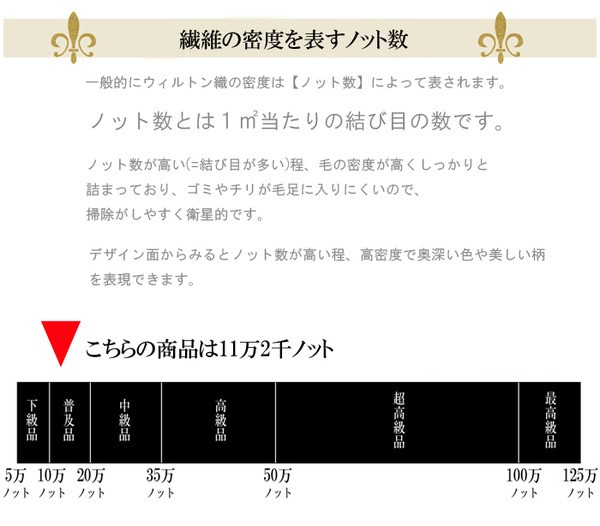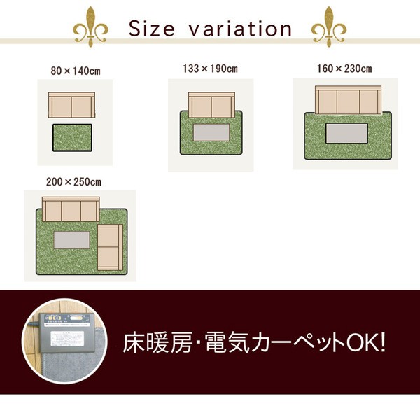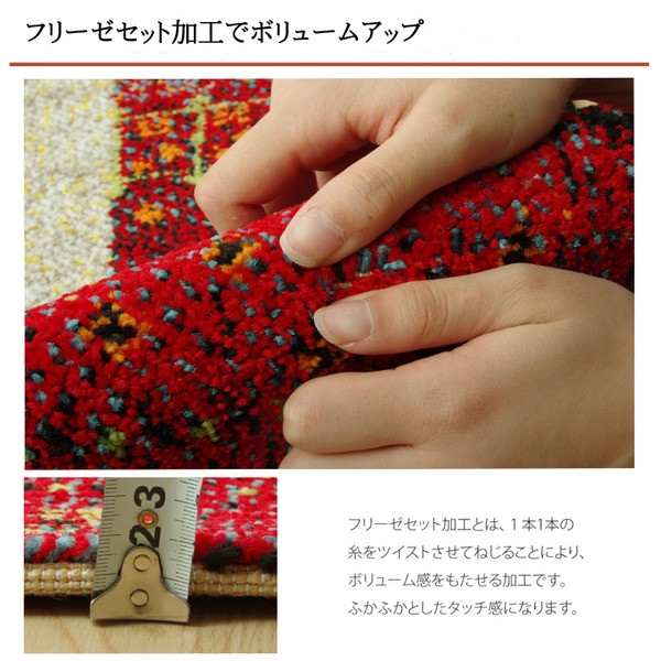 トルコ製のウィルトン織りカーペットです。本商品のパイル部分にはポリプロピレン素材を使用しております。ポリプロピレンはヘタリにくく、耐久性に優れ、繊維の中でも軽い素材です。また、汚れが付着しにくく、遊び毛や毛玉が非常に出にくいという特徴もあります。本商品にはフリーゼセット加工を施しております。フリーゼセット加工でパイルをツイストすることによりボリューム感を出し、ふかふかとした肌感触に仕上げました。ホットカーペットカバーや床暖房にも対応しております。安心して年間お使い頂けるカーペットです。