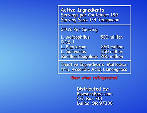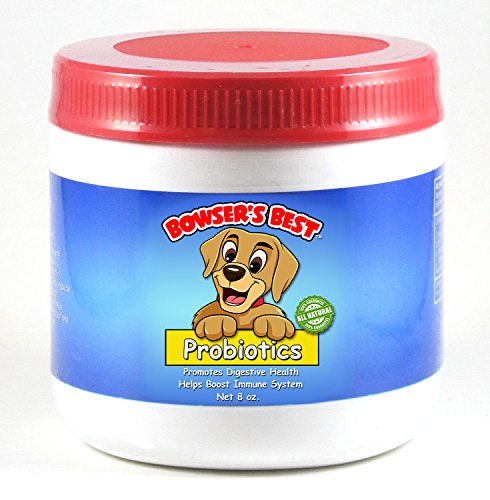 -. Feature : Bowser's Best probiotics for dogs is designed to restore normal intestinal flora, reduce build-up on the colon wall, and help regulate normal food absorption. It will help maintain a healthy intestinal tract and help fight disease and illness in your pet. / The simple step of improving your furry friend's gut health with a good probiotic can literally make all the difference. When Fido's intestinal flora is out of whack, how he feels and acts can be out of whack, too. The easiest way to get your canine companion back on track and crowd out the bad bacteria, is to normalize the good flora with probiotics. / Probiotics help your dog's intestinal track to accept the food he or she eats and absorb the nutrients into the body. Bowser's Best probiotic powder provides Lactobacillus acidophilus, Lactobacillus plantarum, Lactobacillus salivarius, and Bacillus Coagulans. Very stinky stools, bad breath, and a foul body smell could signal that your dog has a bacterial imbalance. Probiotics will help crowd out the bad bacteria causing the bad smell. / Great for cats, too (just don't tell them a dog is on the label)! Dogs 50 pounds and over need only a ¼ teaspoon daily; small dogs and cats need only 1/8 teaspoon daily as a dietary supplement. This 8-ounce container equals 189 servings (1/4 teaspoon each serving). / Made in the USA!