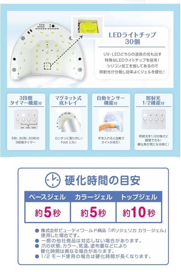 | UV・LEDどちらの波長の光も出す、特殊なLEDライトチップを採用!!シリコン加工を施してあるので、照射熱が分散し、効率よくジェルを硬化します。照射光を1/2の強さに調整できるので、爪の薄い人や硬化熱が気になる時にも。 |