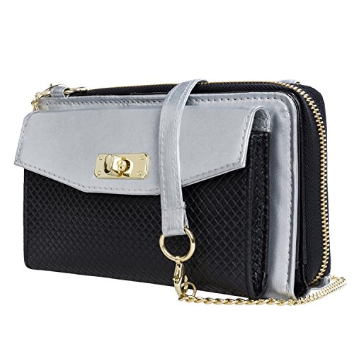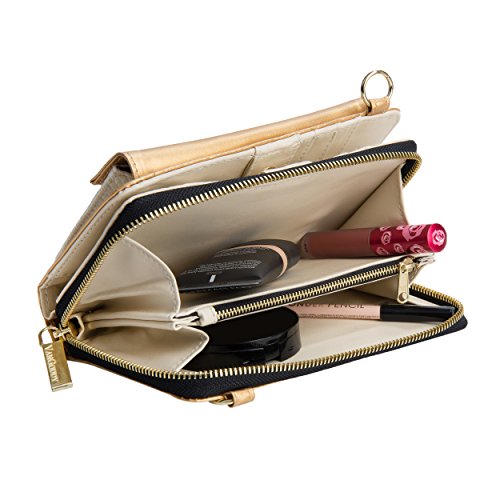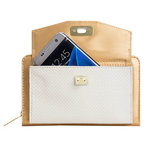 Crossbody Clutch Gold / White for iPhone X / 8VanGoddy Venice II ClutchThe Venice II is a Universal wallet phone clutch featuring a front pocket with a metal twist lock for holding small items such as a cellphone. The wallet has 9 card holders and one clear ID card holder to make it easy to organize the essential cards. Venice II has spacious interior pocket to store multiple small items such as money, makeup, pens, etc. The Exterior is made of PU leather with matching strap along with dual chains for additional height Adjustment and choice of style. The Venice II could be worn in various carrying options: Clutch, Cross-body, or Shoulder.