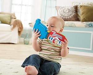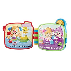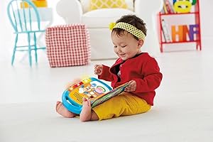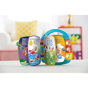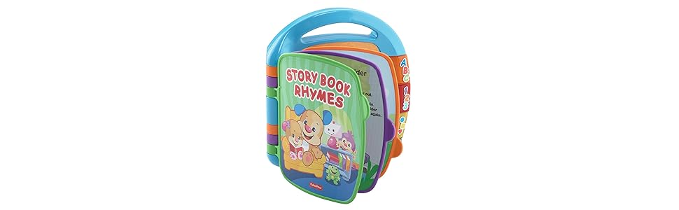 Six favorite songs encourage baby to turn the pages and sing along! Hear 'Itsy Bitsy Spider', 'Row, Row, Row Your Boat', 'One, Two, Buckle My Shoe', 'Animal Fair', 'Pat-a-Cake,” and 'Hickory Dickory Dock'. Plus, there are letters, colors, numbers, and fun surprises to discover on each page! When baby presses the three big light-up buttons on the side, hear even more learning content: ABC’s, 123’s, shapes & numbers. Favorite Laugh and Learn characters lead the way, making learning fun and inviting. The carry handle on top lets you take the Storybook Rhymes Book along wherever baby goes!