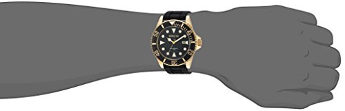 Yellow gold-plated stainless steel case with a black silicone strap. Uni-directional rotating yellow gold-plated bezel with a black top ring. Black dial with luminous silver-tone hands and dot hour markers. Minute markers around the outer rim. Dial Type: Analog. Luminescent hands and markers. Date display at the 3 o'clock position. Caliber PC32A quartz movement. Scratch resistant mineral crystal. Pull / push crown. Solid case back. Case size: 44 mm. Case thickness: 12 mm. Round case shape. Band width: 22 mm. Band length: 8.65 inches. Tang clasp. Water resistant at 200 meters / 660 feet. Additional Info: suitable for professional marine activity serious surface water sports and skin diving. Casual watch style. Invicta Pro Diver Black Dial Mens Watch 90303.Feature