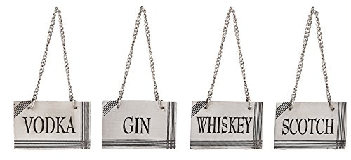 -. Feature : Includes four labels: gin, vodka, whiskey, and rum- Ideal addition to any barware set / These elegant liquor tags are the perfect addition to the upper class bar! / Makes a great gift for the wine connoisseur / Wrapping nicely around the neck of your bottle or decanter, they'll tell everyone what's in each bottle. / Made of silver-plated material these chic tags will make a statement!