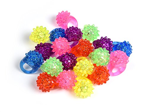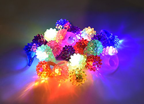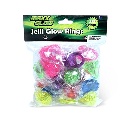 Maxx Glow Jelly rings are made of a stretchy, Jelly material and feature assorted colored LEDs. Maxx Glow Jelly rings are packaged 20 rings per bag. Light up flashing rave Jelly rings make the perfect gift to use for party favors, birthdays, raves, Halloween trick O' treats, stocking stuffers, new year celebrations and more. Simply press the ring on and watch it flash. Press the ring again to turn off. Batteries are included and pre-installed. Batteries cannot be replaced or recharged. Rings not for children under 3 years.Feature