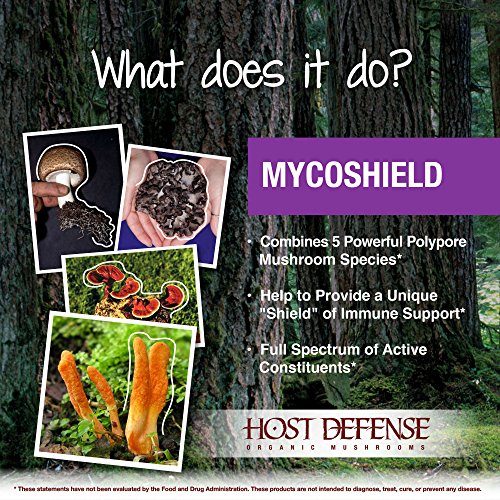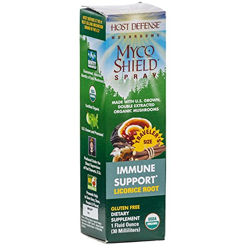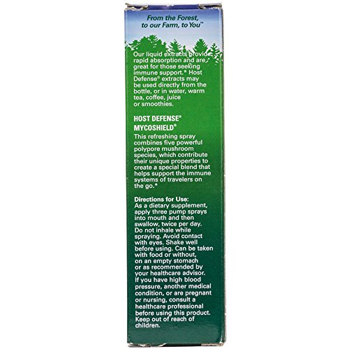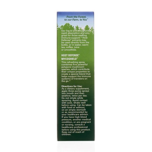 Studio : Host Defense Publisher : Host Defense Binding : Health and Beauty Product Description Host Defense MycoShield spray combines five powerful polypore mushroom species: Agarikon, Red Reishi, Chaga, Birch Polypore and Turkey Tail. These five mushrooms provide a unique "shield" of immune support*, available in a perfect traveler's size. Flavored with certified organic cinnamon oil, MycoShield offers a refreshing taste and is a must-have item for travelers on the go! 0