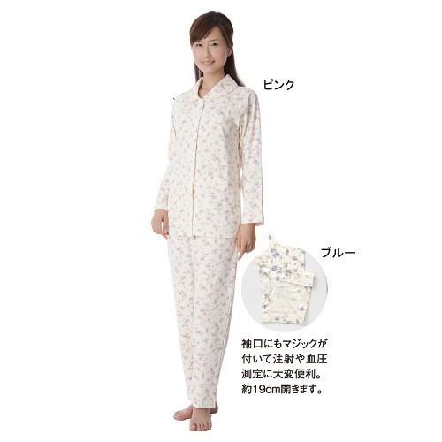 | 前立てと袖口は、ボタンの代わりに丸型マジックを使用しており、注射や血圧測定に大変便利です。約19cm開きます。 |