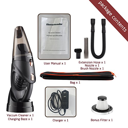 Package included:Car Vacuum x 1,Extension Hose x 1,Brush Attachment x 1,Crevice Attachment x 1,Charging Base x 1,Charger x 1,Carry Bag x 1,Operation Manual x 1,AND A BONUS FILTER.
