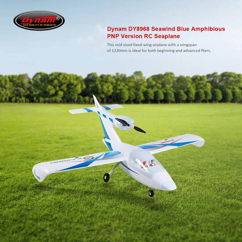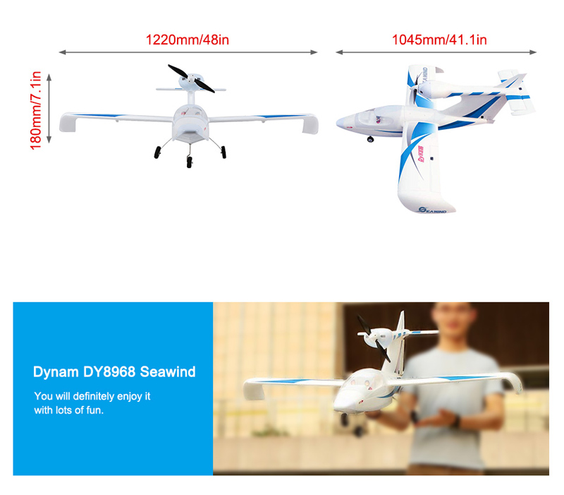 The Dynam Seawind is a very unique aircraft as it is a seaplane with its motor mounted off the front of its very large rudder. It is made from foam and the nose and hull come covered with plastic which protect the aircraft whilst landing on any?surface. The Dynam Seawind also comes with an optional tricycle undercarriage system for those who are only flying off land. This aircraft is ideal not only for those wanting to take off and land on water」ャ but to all intermediate flyers as it is a very?stable platform and its top mounted motor stays well protected. It also has a large wing area and downturned wingtips which provide excellent low speed handling capabilities.