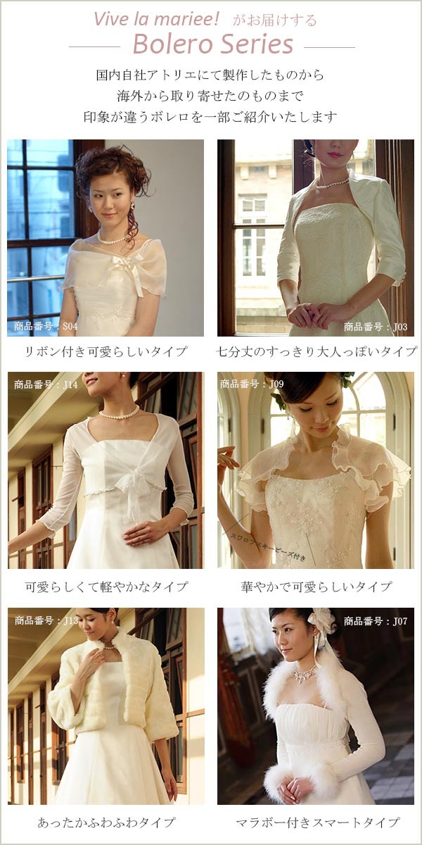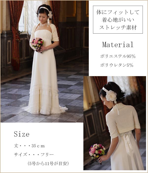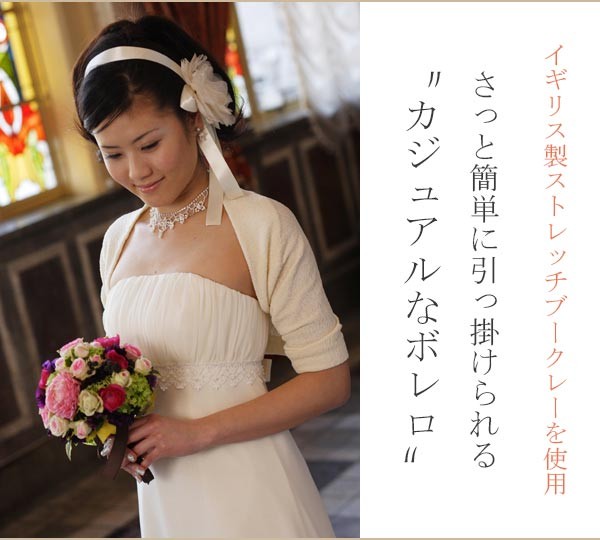 ヴィーヴ・ラ・マリエ!青山店で扱っている、アレンジにおすすめ ボレロです!イギリス製のストレッチブークレーを使用。ストレッチ素材なので体にフィットして着心地がよく、落ち付いた光沢感のある色調でウェディングドレスとの相性も抜群です。*こちらはボレロのみの商品となり、ドレスは付属いたしません。 ご注意ください。【検索キーワード】ウェディングドレス/ウエディングドレス/白ドレス/マリッジ/ブライダル/ガーデンウェディング/フォトウエディング/花嫁/新婦/ブライズ/挙式/結婚式/披露宴/パーティ/パーティー/チャペル/教会/人前式/セレモニー/海外/リゾート/ホテル/式場/2次会/1.5次会/前撮り/アクセサリー/ヘアアクセ/ウエディング小物/ウェディング小物/Wedding/Bridal/ギフト/プレゼント/贈り物/花/フラワー