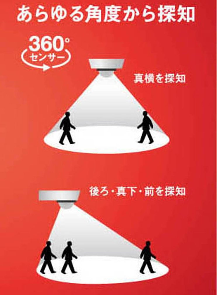Detecting all angles and intimidating suspicious individuals because they are equipped with a 360 ° sensor * 1 Direct lighting intensity (Lux) Compared with our measurement values * 2 Comparison with halogen bulbs