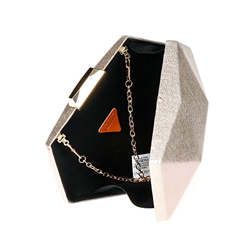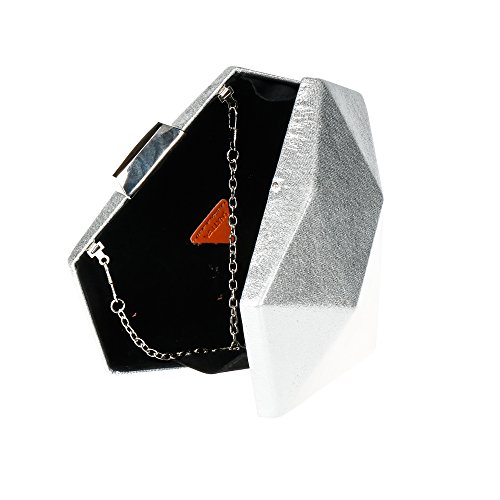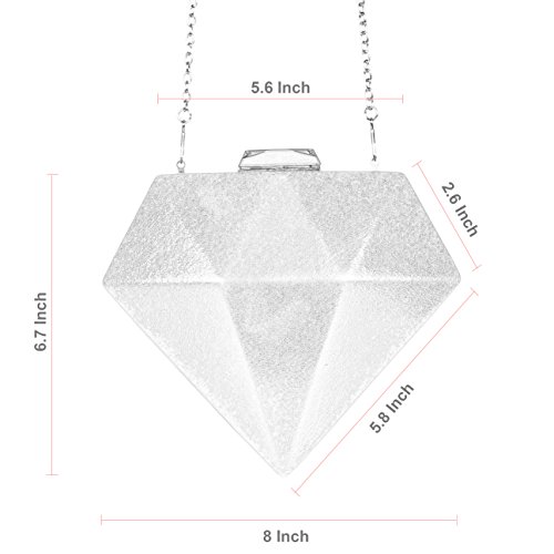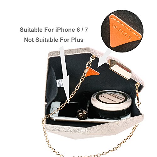 Comes with clasp closure and inside polyester lining . Handbag can easily fit a cell phone, wallet, compact mirror, lip gloss, and a pack of gum. Conveniently, you can spend the night hands free with the detachable silver chain that is included.