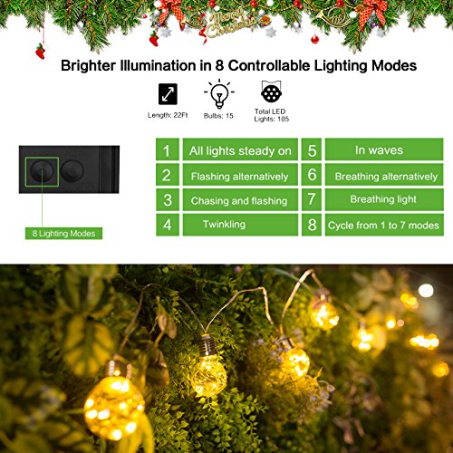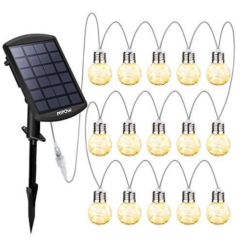 Mpow Solar String Lights, 22ft 15Globe Christmas Lights with 8 Modes, Waterproof Detachable Solar Powered Panel for Outdoor Christmas Tree, Party, Garden, Patio, Backyard, Indoor Decorations Lighting